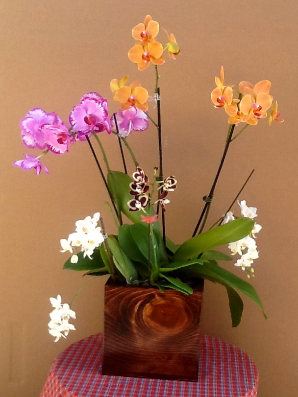 We can create custom arrangements using seasonal flowers, exotic plants and hand made wood boxes.